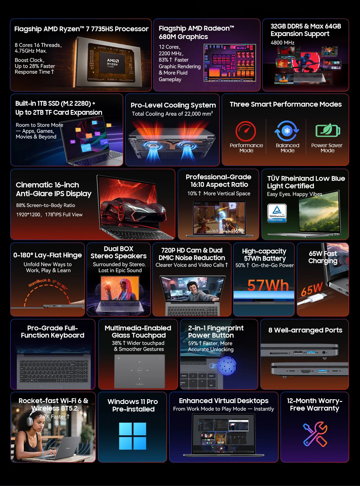 BLACKVIEW ‎GamiBook 8 AMD R7 7735HS 16" 16GB DDR5 512GB SSD 5000MAH Laptop Windows 11 Pro 1920*1200 Backlit Keyboard 120Hz